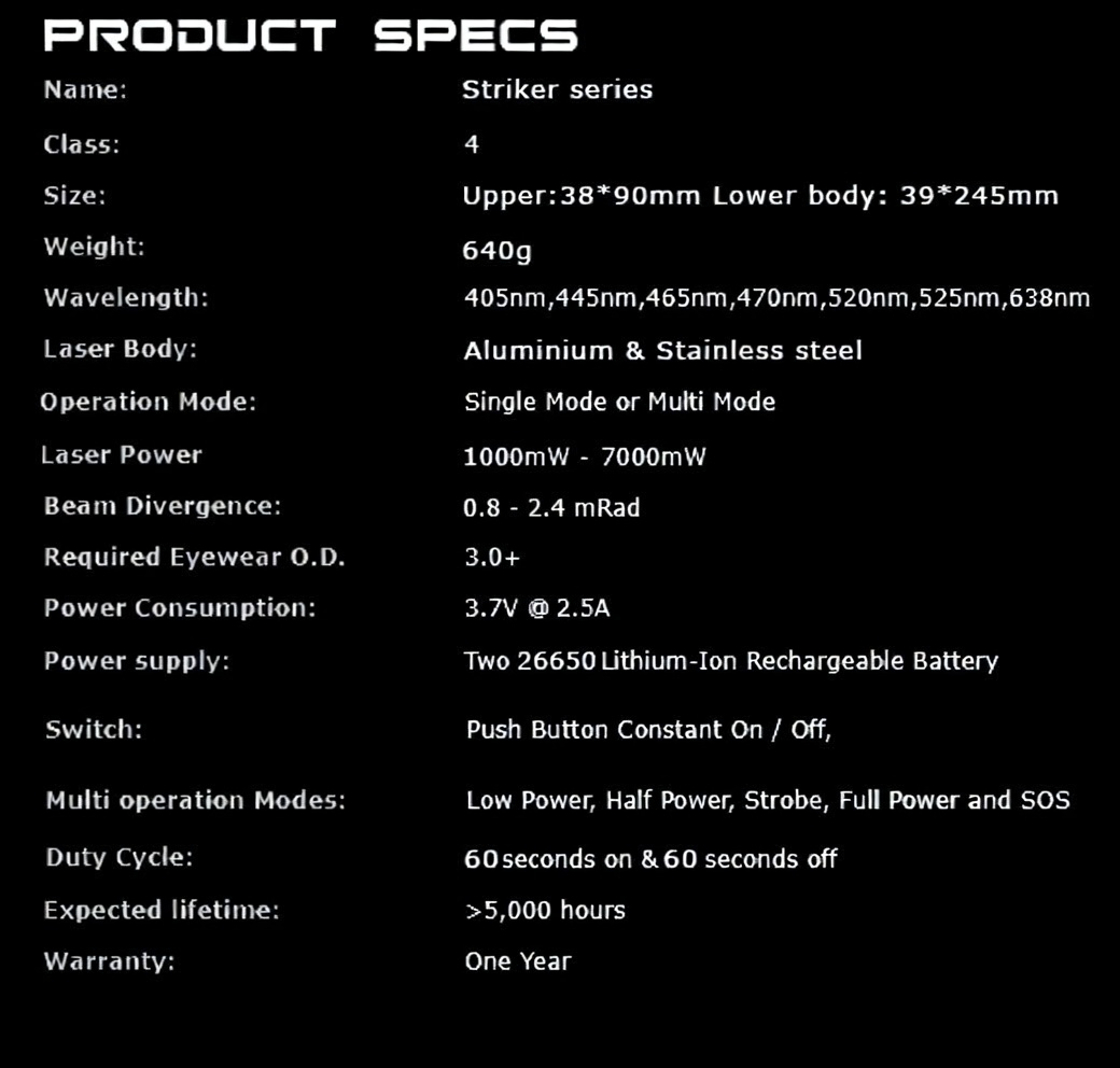 Received my Striker 7.5 Watt 455 nm blue laser a few weeks ago. Definitely turned out to be worth the month long wait. The outstanding build quality lives up to everything I've read about Sanwu. Operation is flawless as well so far. Not as bright as I expected, but it makes up for this with burning power. Would definitely recommend the x5 beam expander for practicality's sake. Waiting for a 1 Watt green Challenger II now!